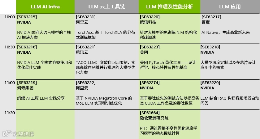 GTC 2024 大会 China AI Day 线上专场,是 NVIDIA 为国内 AI 开发者、技术领袖和决策人举办的中文演讲专场,将于 3 月 19 日上午 10:00 在线举办。China AI Day 将以“大语言模型(LLM)”为主题,共分为四大专题:LLM AI Infra、LLM 云上工具链、LLM 推理及性能分析、LLM 应用,共计 13 场精彩演讲。将深入探讨 LLM 性能的极致优化,覆盖架构、训练、推理、量化、AI 工作流 RAG 等多个维度,并为您详细呈现 LLM 在互联网核心应用、芯片设计等领域的案例。