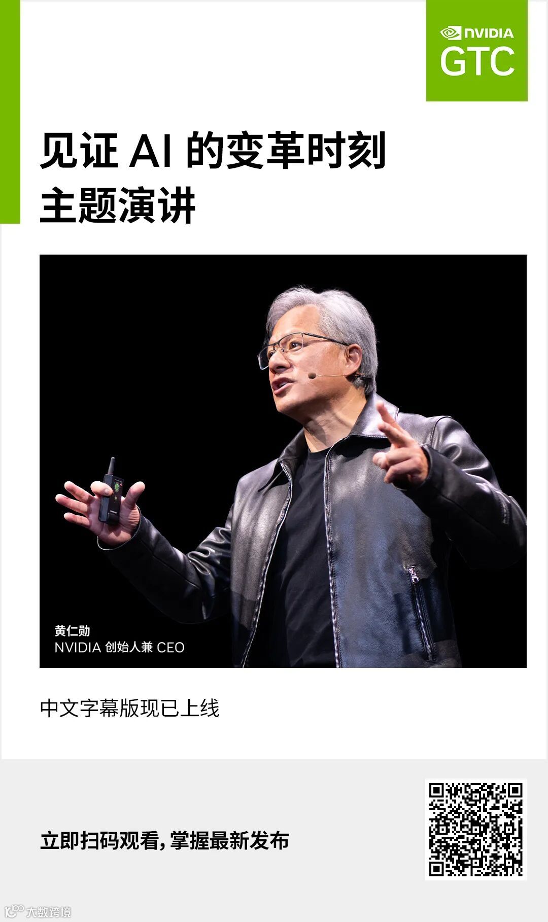 扫描下方海报二维码,观看 NVIDIA 创始人兼首席执行官黄仁勋的 GTC 2024 主题演讲,中文字幕回放已上线,听他分享塑造未来的 AI 突破!