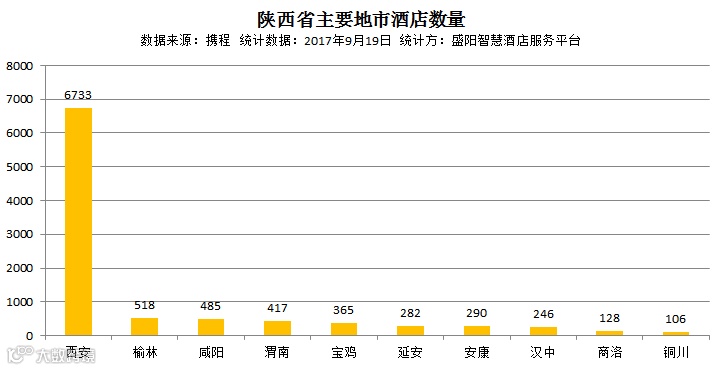 根据盛阳智慧酒店服务平台对携程实时数据的统计,陕西前10大旅游目的地合计拥有酒店近1万家,其中,70%集中在西安,榆林、咸阳、渭南、宝鸡次之。值得注意的是,除了北京、重庆、上海这3个直辖市以外,在省会城市里,西安市的酒店保有量仅次于成都、广州。