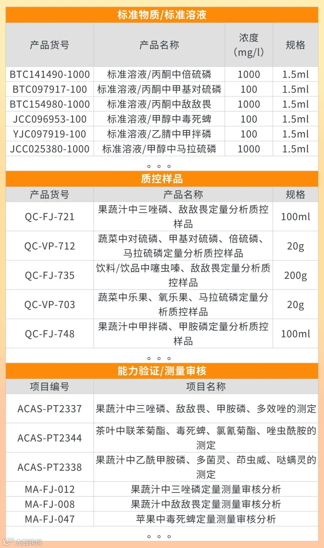 ●质控样品模拟真实检测场景(如蔬菜、果蔬汁中的多种有机磷残留),助您在日常检测中验证方法可靠性、监控实验过程稳定性;
