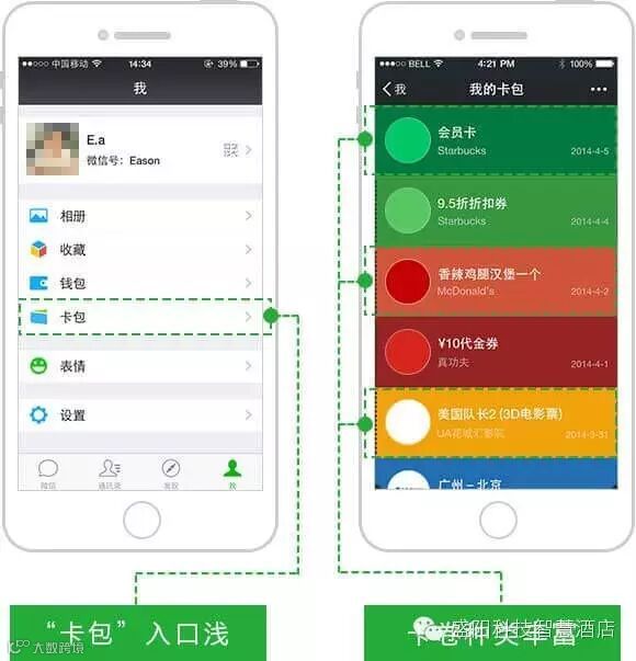 3) 微信“卡包”,酒店生活圈,连接酒店周边吃、行、游、购、娱等商家