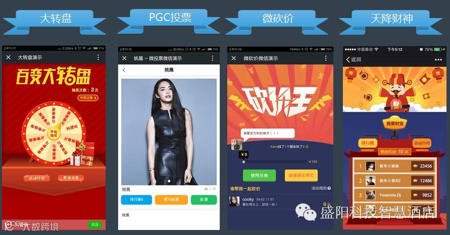 传统酒店营销方式单一,营销手段落后,与客互动频率低,缺乏互动深度。包括盛阳智慧酒店平台在内的诸多微信第三方开发平台,都推出了一系列带有趣味性和参与性的互动式营销插件,包括应用类互动、抽奖类互动、传播类互动、竞技类互动等,正成为酒店吸粉、活粉的应用工具。