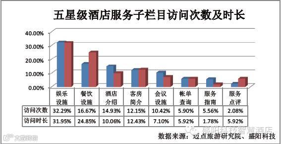 在酒店服务栏目中,从访问次数上来看,娱乐设施高居访问次数第一,其次依次是餐饮设施、酒店介绍、客房简介等。从访问时长上来看,娱乐设施的访问时长高居第一,其次是餐饮设施和客房简介。用户在酒店一项重要活动是进行娱乐休闲,这就导致用户对酒店所具备娱乐设施的极大关注,而这直接导致酒店服务在酒店中的高访问次数及访问时长。