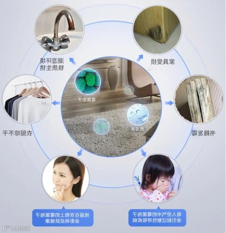 当环境湿度大于60%时,霉菌即可生长;湿度大于85%时,霉菌孢子大量滋生,通常导致衣服晾不干、地面积水、墙壁发霉、铁质生锈等现象。