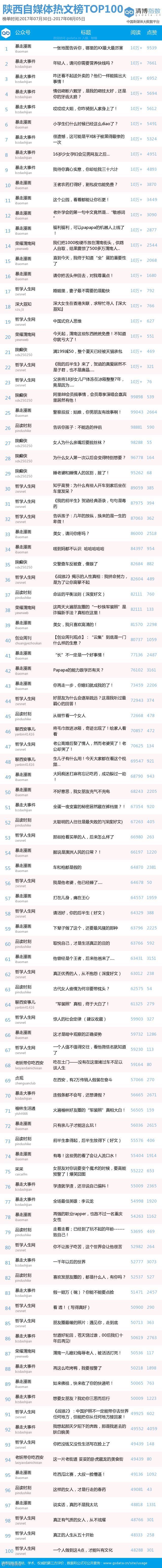 最新陕西自媒体周榜100强重磅出炉!TOP100上周共计发文3347篇 ↓ ,文章总阅读量2217万+ ↑ ,总点赞数达到25万+ ↑ ,平均阅读量76万+ ↑ ,平均点赞量8761 ↑ ,头条总阅读量330万+ ↓ 除去总发文量各项数据同比上期有所增加哦!(数据后面箭头“↑”“↓”分别代表同比上期上升或下降)。