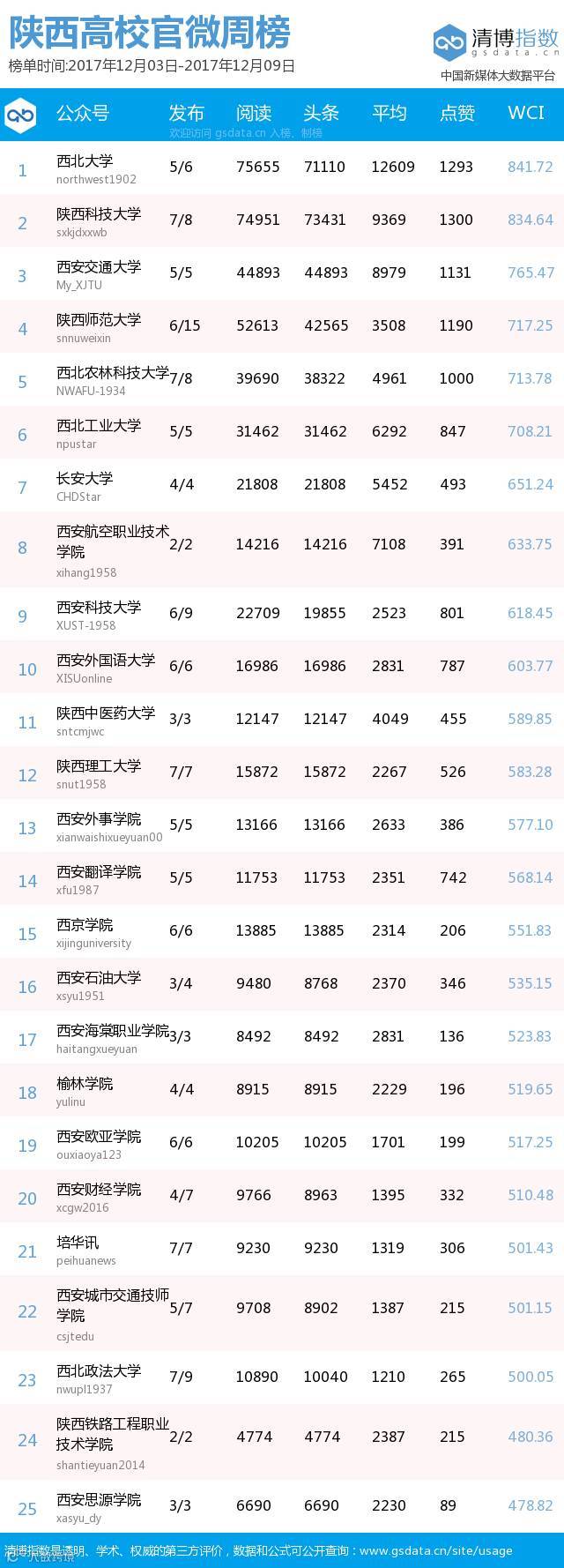 ● 本期陕西教育类新媒体周榜包含以下四个榜单:依次为陕西省教育部门官方微信周榜TOP25、陕西高校官方微信周榜TOP25、陕西高校自媒体周榜TOP10、陕西教育培训机构微信周榜TOP10。更多行业新媒体榜单可登陆清博指数官网查询:www.gsdata.cn