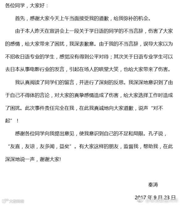 9月23日16时16分,@秦涛繁星点点 发布道歉声明,表示今天上午已经向大家当面道歉,并引以为戒。