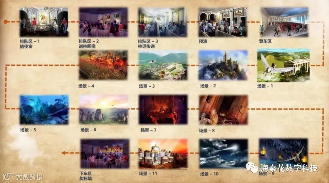 演出效果通常都是按场景来描述,比如场景2中,需要有演出灯光,背景音乐BG,或者点源音频(配合特效/机模等),演出特效—可以是喷雾/喷水,可以是吹风,可以是香氛,甚至可以是火焰等;有一些演出特效是需要投影/视频等,结合主题包装来完成。比如穹顶的星空,或者会动的壁画等。更复杂一点的场景还会设计行动设备或者动态机模,以更逼真的演出效果和角色形象带给游客体验感的高潮。所以说,演出效果的设计是一个景点是否出色的关键。