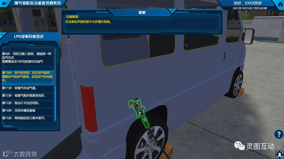 灵图互动针对包括中控柜、压缩机、LPG加气机、流体装卸臂等的重点设备进行了细致的建模和交互设计,学员能够通过与真实场景一致的三维模型对设备进行深入学习,并藉由人机交互体验完整的操作流程实训。