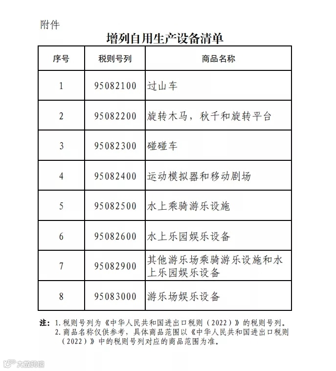 一、对《财政部 海关总署 税务总局关于海南自由贸易港自用生产设备“零关税”政策的通知》(财关税〔2021〕7号)第二条所指生产设备,增列旋转木马、秋千及其他游乐场娱乐设备等文体旅游业所需的生产设备,按照《中华人民共和国进出口税则(2022)》商品分类,包括:旋转木马、秋千和旋转平台,过山车,水上乘骑游乐设施,水上乐园娱乐设备等8项商品。具体范围见附件。