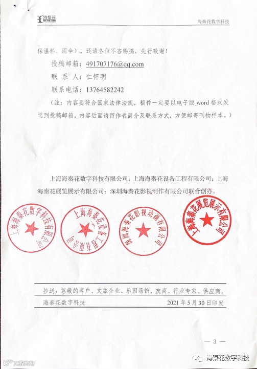 现面向海秦花尊敬的客户、文旅企业、主题乐园、科技场馆、同行友商、行业专家、供应商、海秦花内部管理层等企业和个人正式约稿,海秦花深信,行业的繁荣来源于行业人的努力,因此,海秦花愿意与行业内的企业和从业者一起,为文旅科技行业更加繁荣贡献力量,愿意将海秦花企业内刊办成即是内部学习资料,又是凝聚行业专业观点、核心技术、创新产品、成功方法、成果展示的一个刊物。