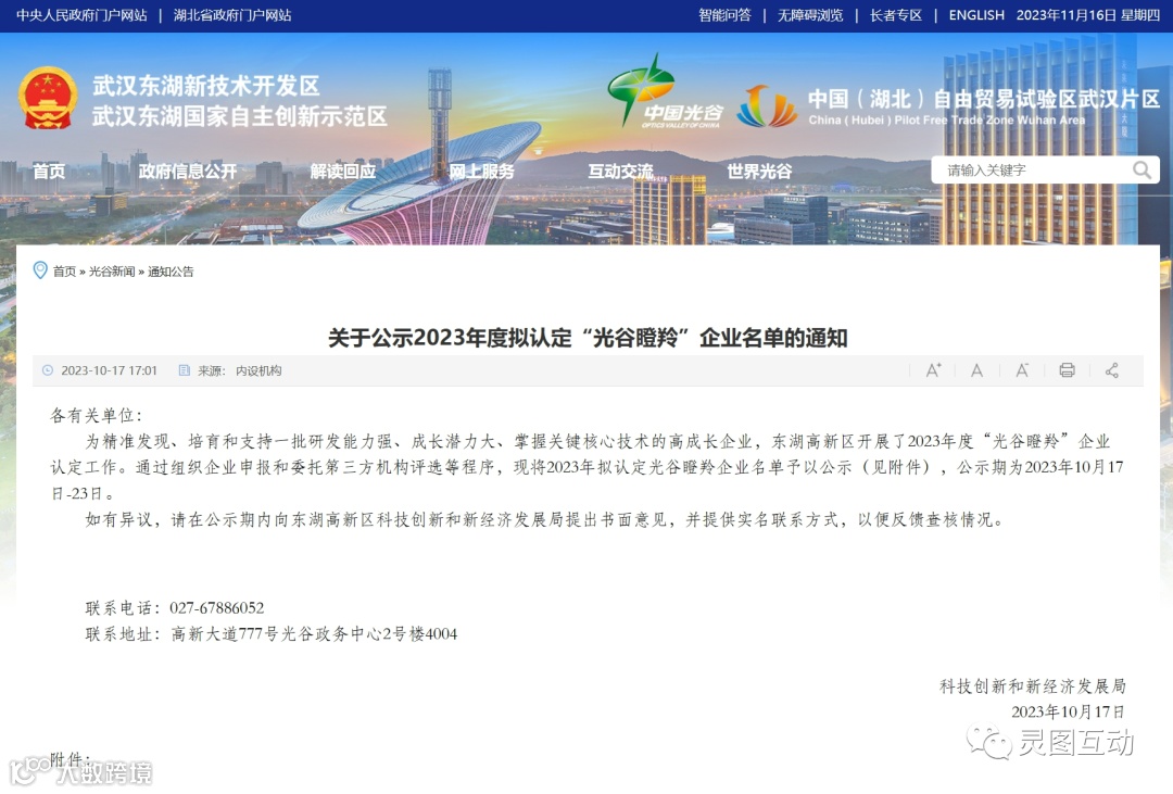 东湖新技术开发区科技创新和新经济发展局发布了《关于公示2023年度拟认定“光谷瞪羚”企业名单的通知》,灵图互动(武汉)科技有限公司有幸位列其中。