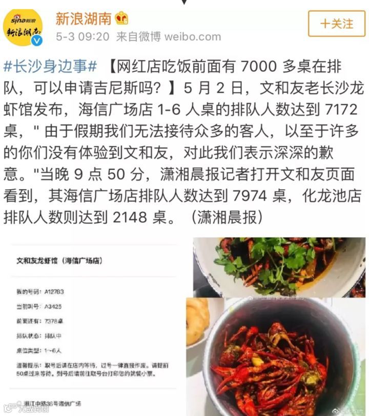 五一假期期间,有记者到长沙网红小龙虾店“文和友”排队就餐的时候,发现前面竟然已经排了4612桌,真是恐怖至极。