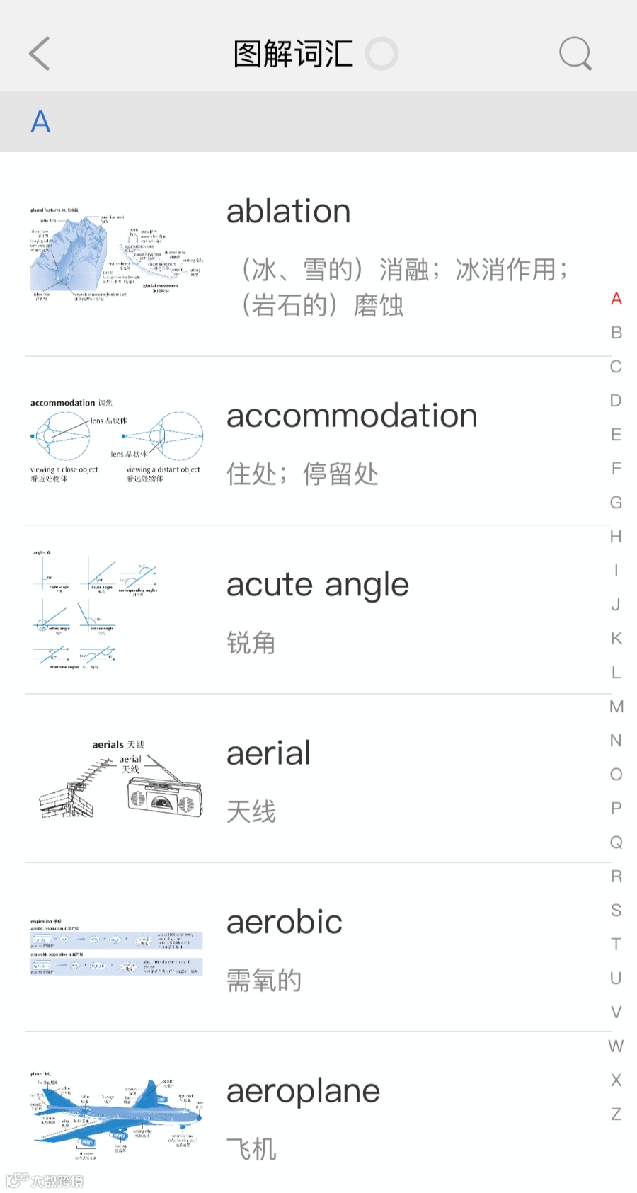 首页特别加入”图解词汇“专栏,汇总词典内的精美插图,通过图文并茂的方式辅助初学者直观认识单词。