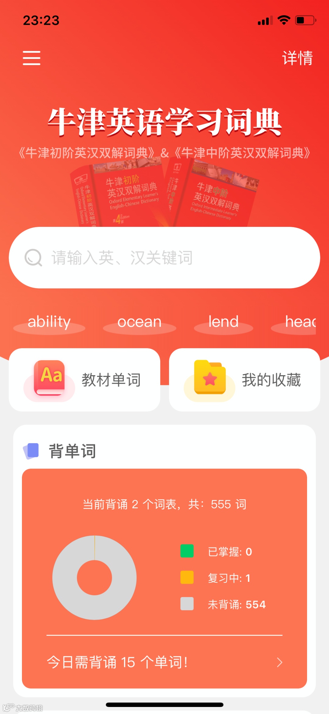 牛津英语学习词典App特别设计背单词栏目,每天定时提醒背诵打卡,帮助养成坚持背单词的好习惯。