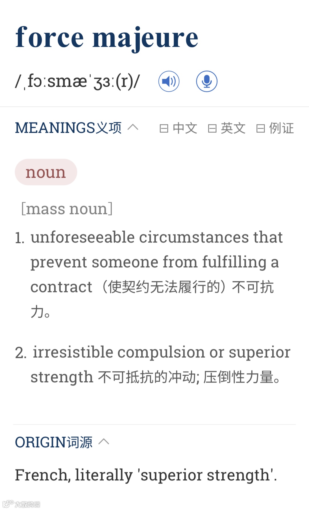 majeure一词在各大英语词典中都没有单独的解释,通常都是和force连用,译为”不可抗力“。