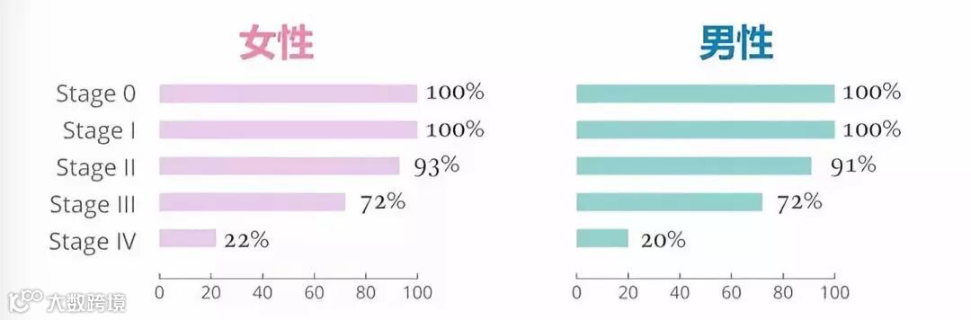 上面这幅图是美国居民五年癌症生存率。虽然不是中国的,但从这幅图我们得出了一个结论: