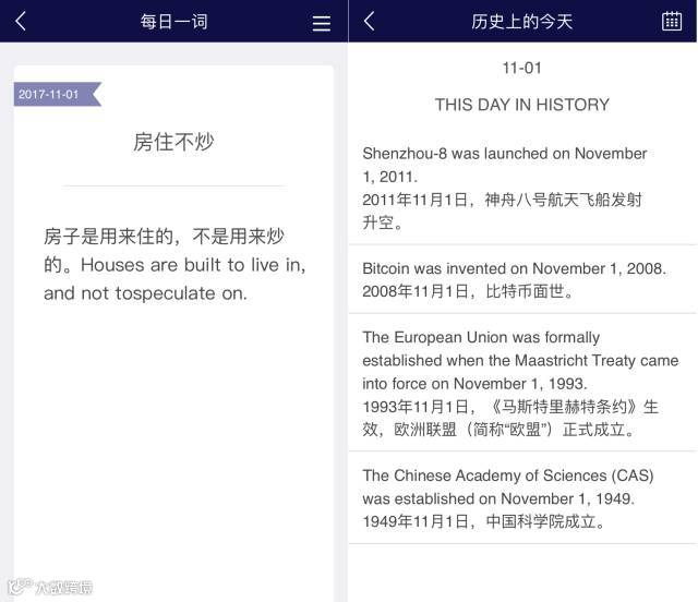 除此以外,《新世纪英汉汉英大词典》APP还有着独特的学习内容:【每日一词】和【历史上的今天】。每天都能学一个新词,读一段历史。