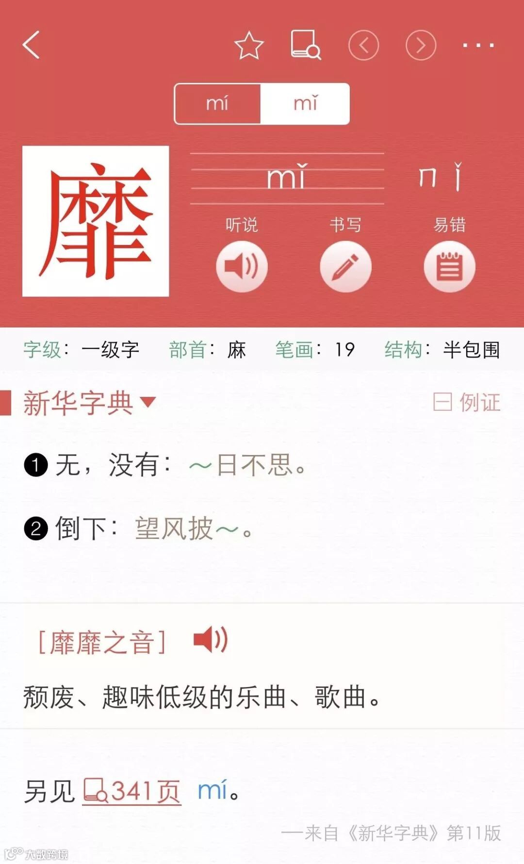 《新华字典》里靡靡之音这个词仍出现在读音mǐ之下,不知道之后的第12版是否会更改