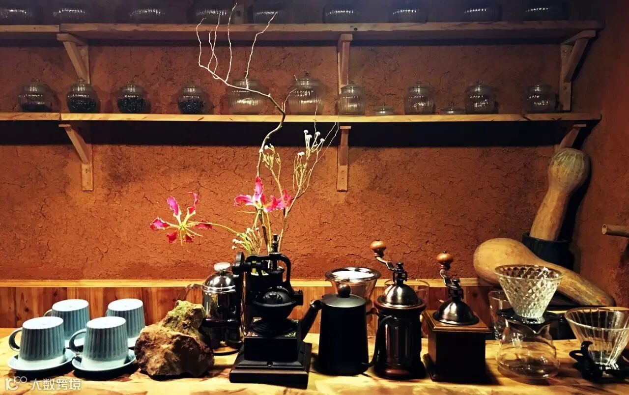 ▲稻坯混土的墙上摆满瓶瓶罐罐,改建成了咖啡一角