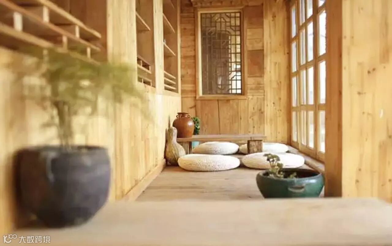 走廊摆上木桌,蒲团,