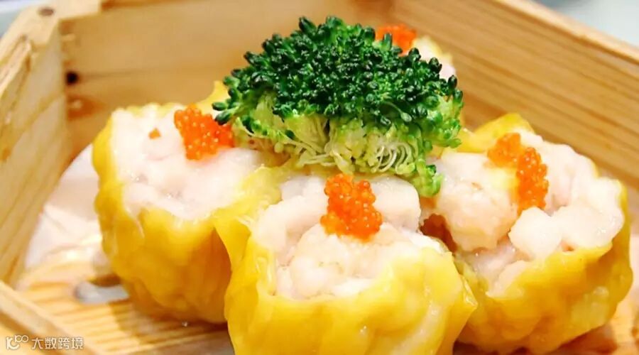 ▲ 干蒸烧卖,用鸡蛋液、水和面作皮,猪肉、虾肉、冬菇作馅,捏成石榴花形,蒸制而成。其色皮淡黄,蟹黄鲜艳,皮软肉爽,味美鲜香。