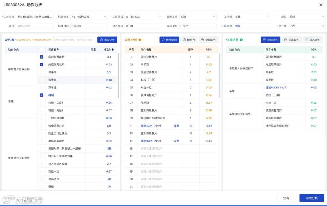 系统会进一步把每个工序,拆解成更细微的基本动作,并为每个动作赋予一个标准时间代码。这些代码和时间值是基于海量数据分析得出的,非常精确。