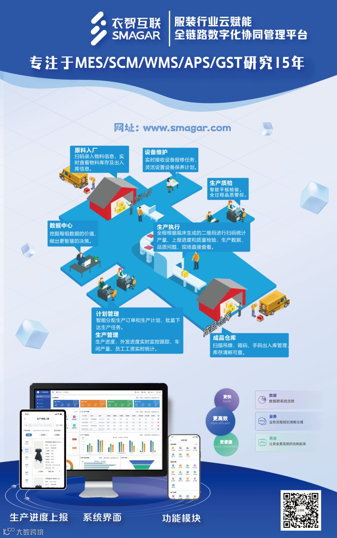 广州衣智互联科技有限公司是一家专注于服装智能制造的科技公司,融合互联网领域前沿技术创新,为服装企业提供基于云端的协同管理平台。云端部署运行于电脑端、手机、平板等,覆盖研发、订单、采购、计划、物料、生产、质检、成品、设备等核心流程,助力缝制类企业全面推进数字化转型,提高生产柔性、缩短交付周期,提升供应链反应能力,实现数据实时驱动决策。