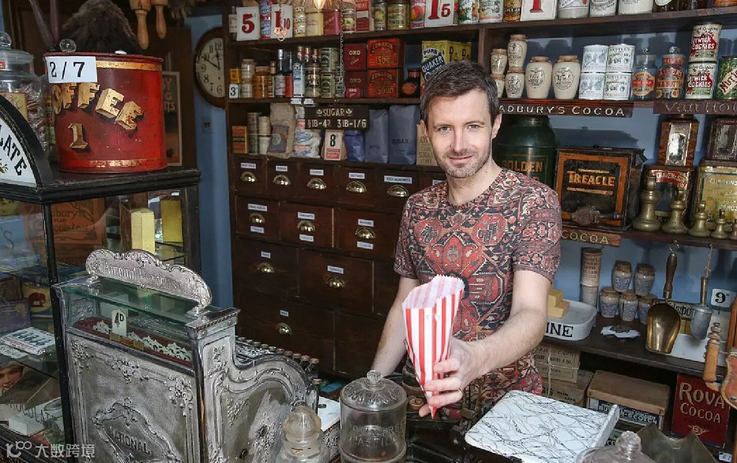 家里的古董和物品,大多是他从网上的古玩店,或是Car Boots集市上淘回来的。此外,他还将房子的部分空间改造成了糖果店,他表示,这里在1920年代以前是杂货铺,所以他会努力寻找适宜的物品,还原当时的场景。店内的装潢及橱窗的设计由他来操办,所有商品也都经过他的精巧包装。