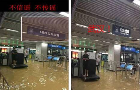 常见反复谣言中,雨情汛情谣言首当其冲。2016年,南方水涝后北方暴雨,武汉地铁口渍水照片被PS成北京地铁口;网传北京大悦城被淹,实为天津大悦城;还有多地接连出现的“有98年那么大洪水”。此类谣言制造成本几乎为零,素材获取简单,却因其与民生紧密相关、“有据可依”,通常能获得广泛传播,迷惑众人。