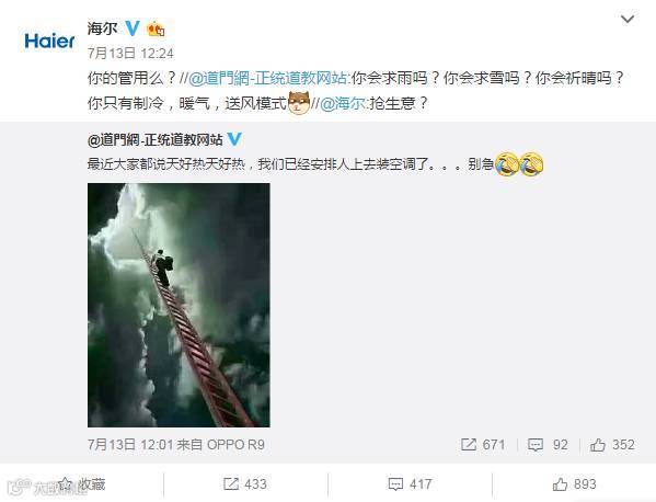 这不,近日全国三伏天热浪来袭,开空调、安空调成为热议话题,活跃在粉丝和和蓝V中的海尔自然成为互动最佳人选。不过,这次与海尔官微公开叫板互动的,居然是道門網,话说是一家正统的道教网站官微。