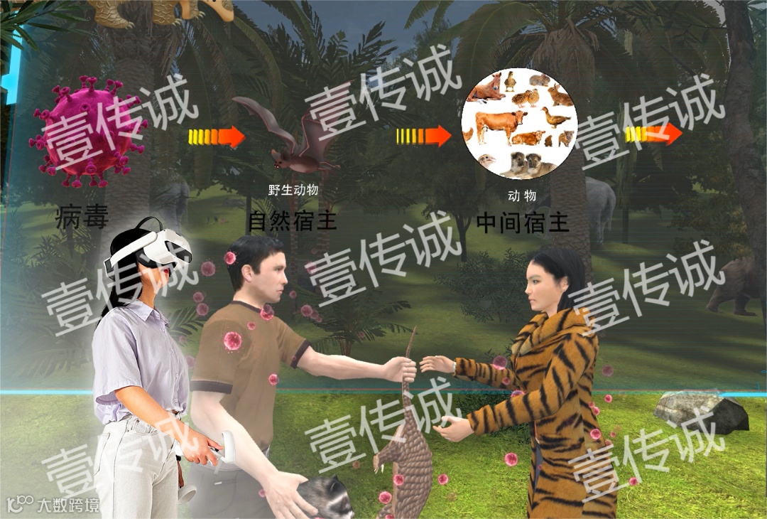 关于野生动物和传染病的知识学习科普,壹传诚利用VR虚拟现实技术,独立开发了VR野生动物与传染病科普。让体验者在虚拟的环境中,近距离的观察了解野生动物,唤醒人类和野生动物和平共处的意识。在360度的体验视角下,体验者和动物同处于一个沉浸式体验环境内,以仿真案例中的人物对话、动作过程为主线,模拟人类猎杀动物、售卖以及造成疾病感染和自然生态失衡等过程,从而引出科普知识:为何人类会因此感染上病毒?为何不能食用野生动物等知识。让人们更加了解这些野生动物是病毒的自然宿主,很多传染病都来通过动物传播。
