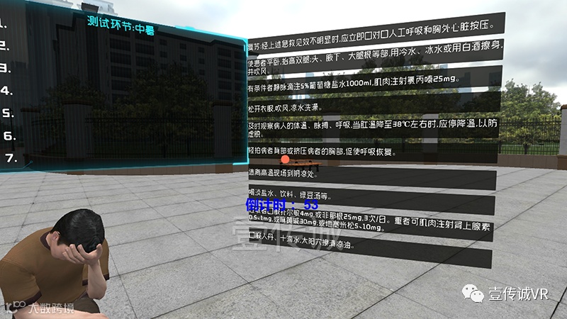 VR中暑急救模拟手把手教你如何应对中暑患者,相比起传统的急救科普教育,真实度更高,趣味性、交互性更强,而且体验成本更低,不受场地和时间的限制,随时随地都可以体验学习,能够做到更好地向大众科普急救知识。
