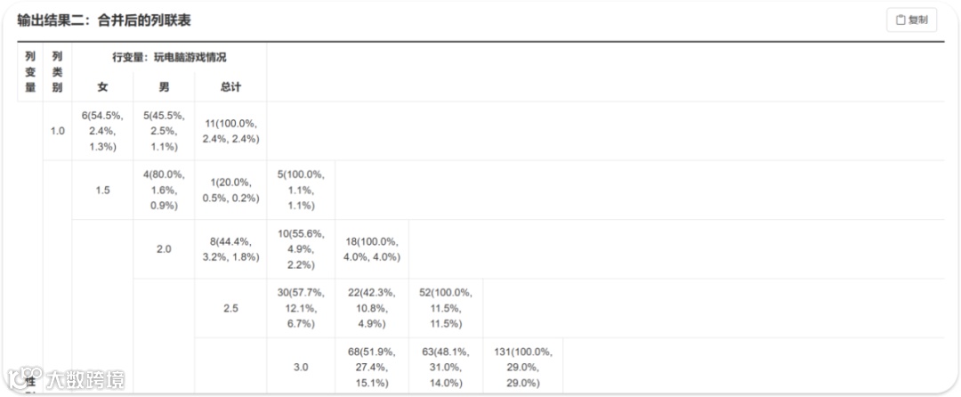 智能解析:您可从该表直观对比各列变量的不同类别,与行变量各水平之间的分布。