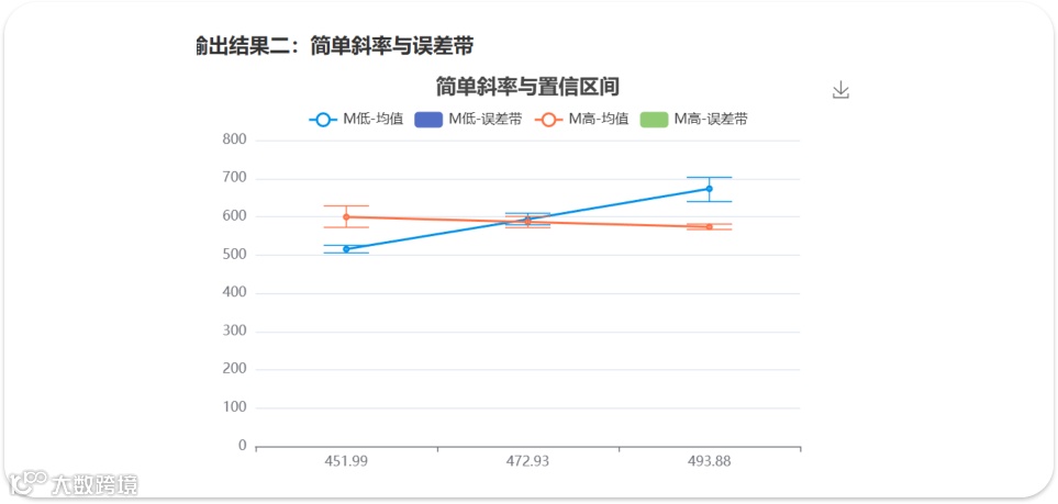 在 X=均值±1SD, M=高/低 时,通过Bootstrap估计Y预测值及置信区间,用于观察调节效应。