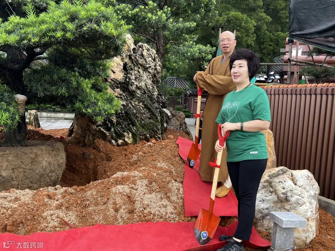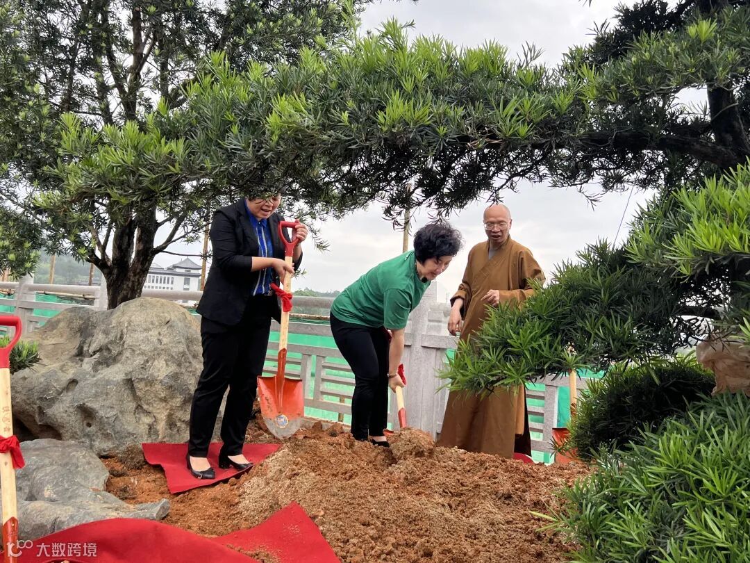云门寺方丈明向大和尚,广东佛学院云门学院副院长兼教务长性国法师,云门寺监院弘静法师,云门学院教研室主任明诠法师,云门学院副教务长闻心法师,云门学院教导主任衍照法师,云门学院教务主任耀空法师,云门寺大知客师海藏法师等接待了杜芸主任一行。随后明向大和尚、性国法师、弘静法师等与杜芸主任、乳源县副县杨贤冰等人共同为两颗迎客罗汉松培土,同行大众纷纷参与植树并合影留念。