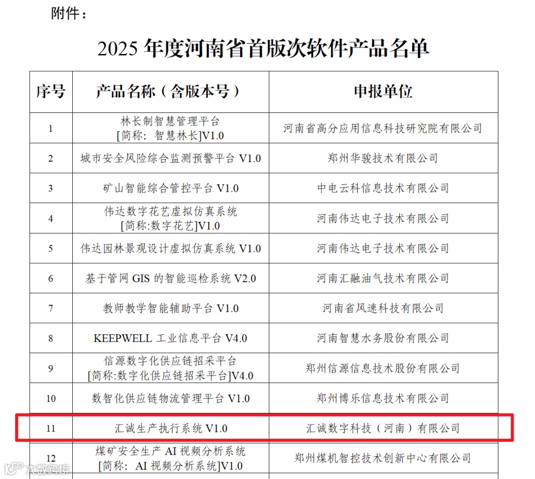 2025年7月18日,河南省工业和信息化厅公示了关于2025年度河南省首版次软件产品认定结果,我司‘汇诚生产执行系统V1.0’成功入选!这一殊荣不仅是对我们致力于软件研发和技术创新的认可,也是对我们在推动河南省乃至全国软件产业发展方面所做努力的高度评价。