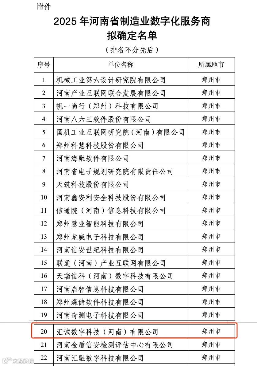 2025年7月14日,河南省工业和信息化厅公布了2025年河南省制造业数字化服务商名单,我司凭借在数字化产品研发及解决方案领域的技术实力与卓越服务,成功入选!这是对我司深耕制造业数字化转型、持续赋能产业升级的权威认可,也标志着我们在推动河南省制造业高端化、智能化、绿色化发展中迈上了新台阶。