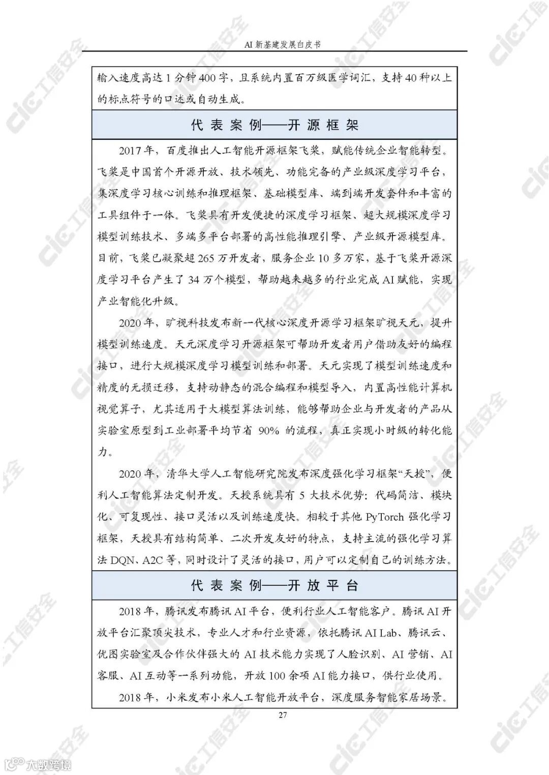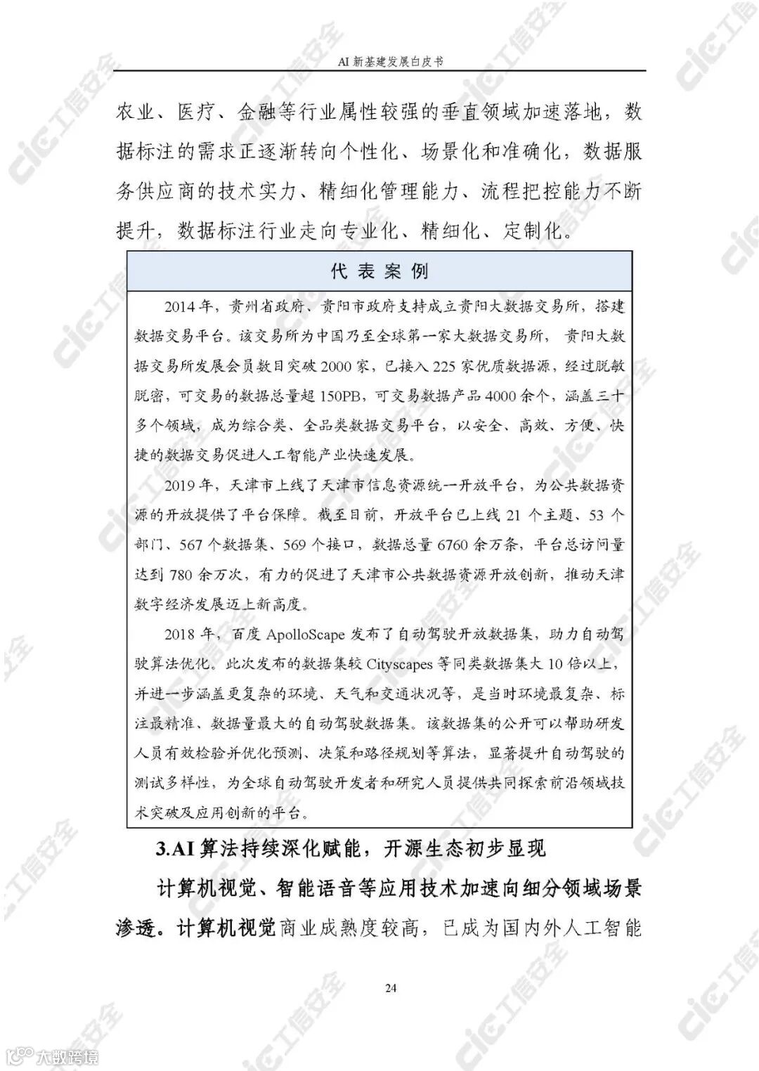 在各级政府、行业企业、资本市场、科研机构的合力推动下,我国AI 新基建呈现蓬勃发展态势。一方面,通过智算中心、公共数据集、开源框架、开放平台等基础设施发挥平台支撑作用,有力支撑人工智能发展;另一方面,通过人工智能的技术赋能性,推动制造、医疗、交通、能源、金融等传统行业转型升级,有力支撑智能经济发展。