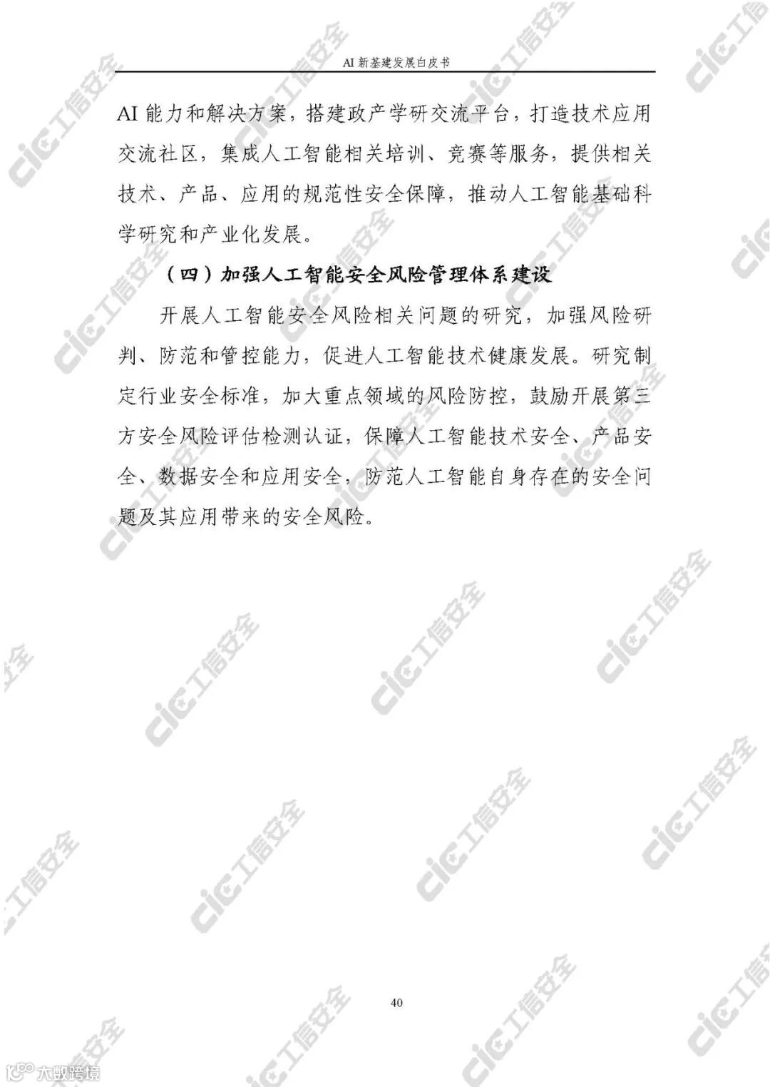 与此同时,我国AI 新基建在技术、数据、融合、安全等方面仍面临着一定挑战,应加大力度筑牢基础、激发活力,加快核心技术攻关、推动应用深化落地、构建公共服务平台、加强安全风险管理,进一步发挥AI 新基建的技术赋能作用和公共基础作用,驱动产业转型升级、助力经济高质量发展。