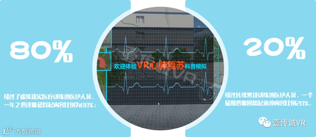 VR具有的沉浸式、交互式、探索成本低的特点为医学模拟教学方案提供几近完美的教案。心肺复苏VR项目的出现引起了大众的讨论,原因很简单,中国每年死于心脏骤停的总人数约为54.4万人。大部分人发生心脏骤停之后,脑血流会突然中断,10秒左右出现意识丧失的情况,只有受到及时救治的人才能够存活,及时进行心肺复苏变得格外重要,但是每年进行的心肺复苏教育演练似乎取得的成效不大,很多现场群众反应自己只是看过没有真正的实操过,不敢随意的进行心肺复苏。