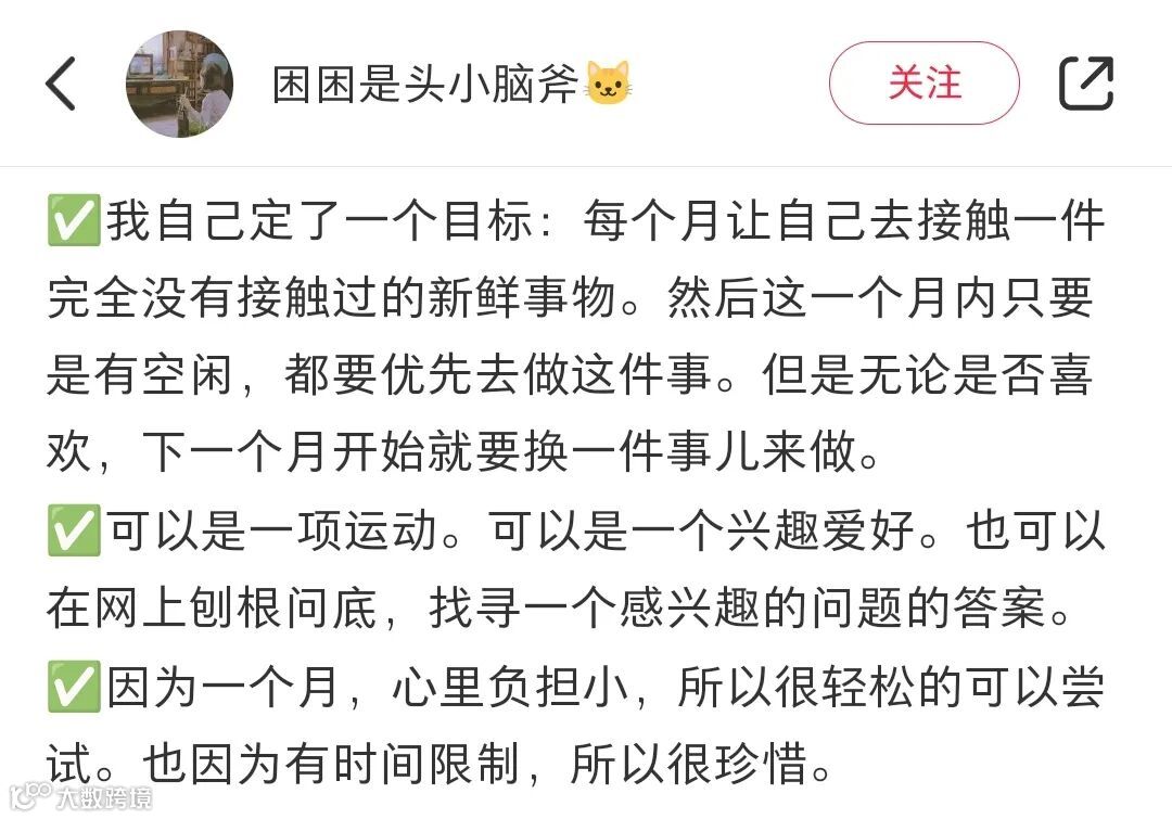 小红书博主@困困是头小脑斧🐱 是最早分享这一方法的人。在她的帖文中她以自己的亲身经历详细介绍了“主题月生活法”,并分享了自己的践行体验和收获,一下子得到了众多网友的关注。
