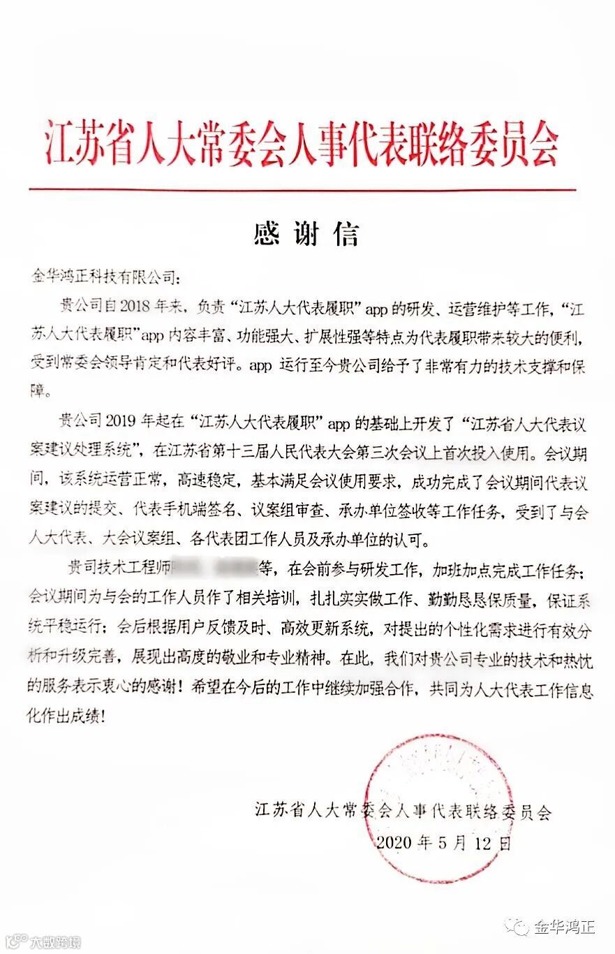 信中写到,从2018年开始,金华鸿正就负责“江苏人大代表履职”APP的研发、运营和维护等工作,受到了江苏省人大常委会领导的肯定和代表们的好评。并在胜利闭幕的“江苏省第十三届人民代表大会第三次会议”上首次投入使用,成功完成了会议期间代表议案建议的提交、代表手机端签名、议案组审查、承办单位签收等工作任务,受到了与会人大代表、人大议案组、各代表团工作人员及承办单位的认可。金华鸿正的技术工程师和相关工作人员,高效的完成了各项任务,展现出了高度的敬业态度和专业精神。