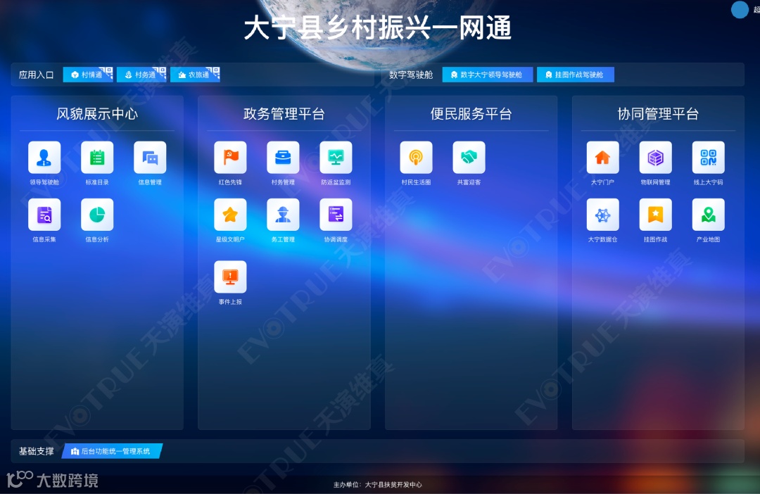 通过数字管控的倒逼服务闭环机制,老百姓办事实现了人在家中等,数据线上跑,办事人联动办,科学高效,规范便捷。这只是天演维真为大宁县全力打造的数字大宁“驾驶舱”把控驾驭的一个平台版块。除此之外,还有“风貌展示中心、政务管理平台、便民服务平台、协同管理平台”等四个空间管理维度,覆盖了农业农村、工业企业、党建统领、社会民生、公共服务等多个领域,通过上报、整理、挖掘、分析、可视化的信息数据专题图,构建起“数据详实精准可观看,分析研判科学可参考,政策措施落实可监控”的数字“驾驶舱”,全面推进数字大宁建设和应用,力争大宁县在乡村振兴数字化改革领域走在全省前列。