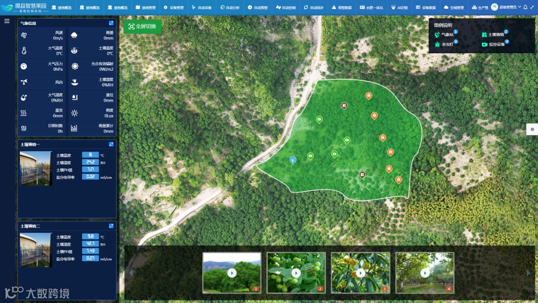 在全县梨果产业核心区建成3700亩的6个智慧梨园示范片。通过在玉露香梨生产基地内部署小气象站、智能虫情分析测报灯、太阳能物联网杀虫灯、高清摄像头、水肥一体化、果径果实测量仪、土壤墒情检测仪、高清大屏等农业物联网设备,利用设备自动获取的环境监测信息、病虫害智能信息等数据,进行梨果生长数据、虫害防控数据、气象灾害预防数据等大数据建模,为隰县梨果产业大数据智能数据提供设备支撑,实现隰县梨果产业的智能化监测、精细化调节、科学化管理、数据化决策。