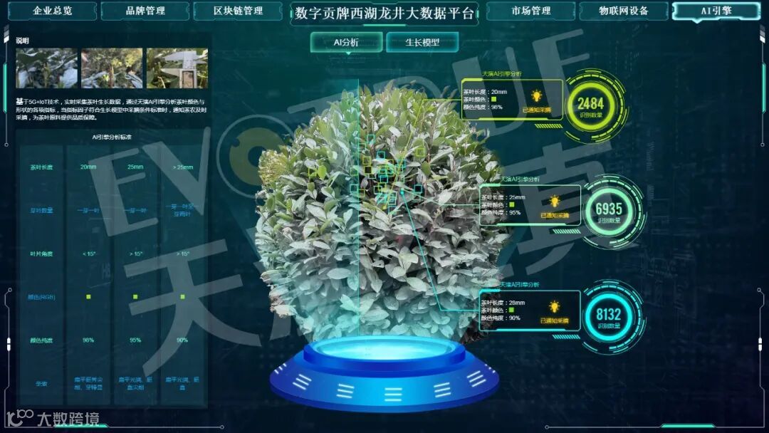 下一步,天演维真将联合合作伙伴中国移动,持续优化“数字贡牌西湖龙井大数据平台”,以打造“数字贡牌”为目标,围绕品种保护、生态茶园、生产管理、茶文旅等方面,采用物联网、大数据、云计算、人工智能、区块链等先进技术,构建“数字贡牌”产业数字化基地,用数字赋能产业,促进产业往高效、智能化发展。