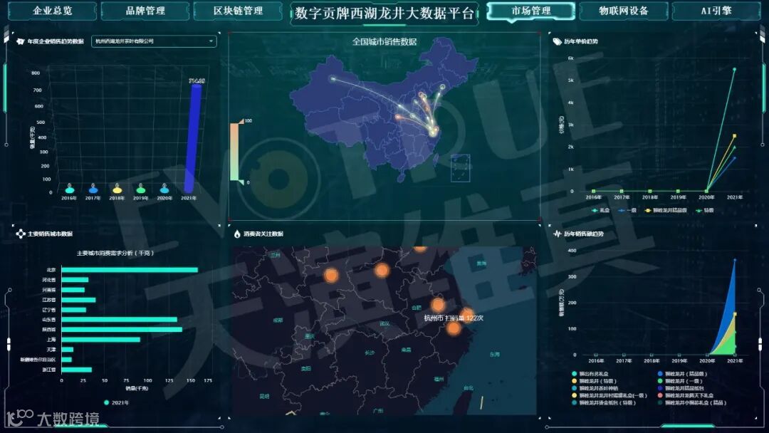 打开由浙江天演维真网络科技股份有限公司开发的“数字贡牌”西湖龙井大数据平台,一张覆盖西湖龙井品牌管理、生产管理、区块链管理、市场管理、物联网设备、生产分析等产业可视化数据资源图呈现在眼前。