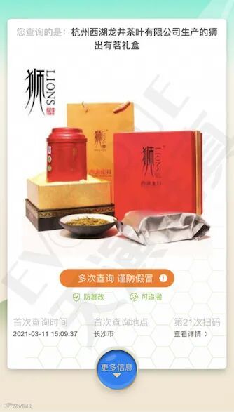 杭州西湖龙井茶叶有限公司通过溯源展示,让消费者掌握“贡牌”西湖龙井全链条信息,比如茶芽修剪过几次,茶园施了几次肥,除过几次草,茶叶几号开采,当天的天气情况,采摘下来多长时间生产加工,生产加工的时间,谁加工的,什么时候入库的,入库后什么时候出库,消费者一键扫码都能立时显现出来,保证消费者能放心喝上正宗原产地的西湖龙井茶。同时在页面内集成“贡牌”天猫旗舰店、京东旗舰店、微信公众号、质量先锋网及公司官网链接,支撑了品牌建设,开拓了营销市场。