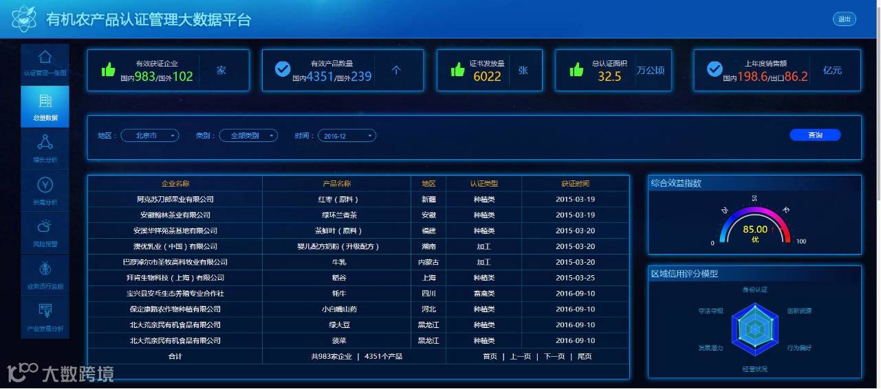 建设有机认证一张图、决策支持、统计分析、可视化展现等。