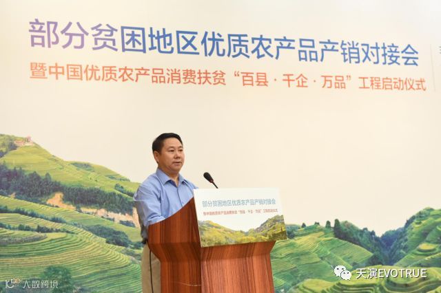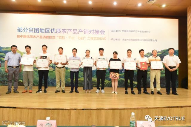 2018年6月26日,由中国优质农产品开发服务协会主办,浙江天演维真网络科技股份有限公司承办的“部分贫困地区产销对接会暨中国优质农产品消费扶贫‘百县•千企•万品’工程启动仪式”在北京举行。来自农业农村部、国务院扶贫办,以及采购商代表、贫困地区政府部门负责人、有关企业代表和媒体等近500人参加会议。